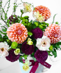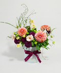For a sophisticated and contemporary take on Chinese New Year, choose the Spring Harmony arrangement. This design features spectacular peach dahlias—representing grace and inner strength—contrasted beautifully against deep plum chrysanthemums. Tall, arching branches add architectural height, symbolizing growth and reaching new heights in the coming year. This airy, sculptural piece brings a breath of fresh spring air to any space.